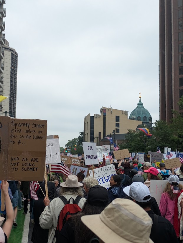 As I parked to join a “pre-game” rally in my small town, people gathering to take the train into Philly, I heard the noise before I saw it. Rounding the corner, the size of the crowd struck me. Over 600 people (a very rough estimate) were lining the main street and courtyard, cheering, chanting. People of all kinds: Black, brown, white, old, young, disabled, LGBTQIA+.